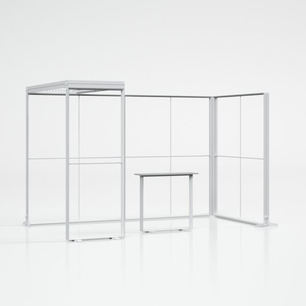 Zestaw wystawienniczy adFrame Smart 4×2 L wyróżnia się zadaszoną częścią, która tworzy efektowny łuk wejściowy. To przemyślane rozwiązanie nie tylko wyodrębnia przestrzeń wystawienniczą, ale także tworzy wyraźne wejście, które zaprasza odwiedzających do zapoznania się z ofertą.
